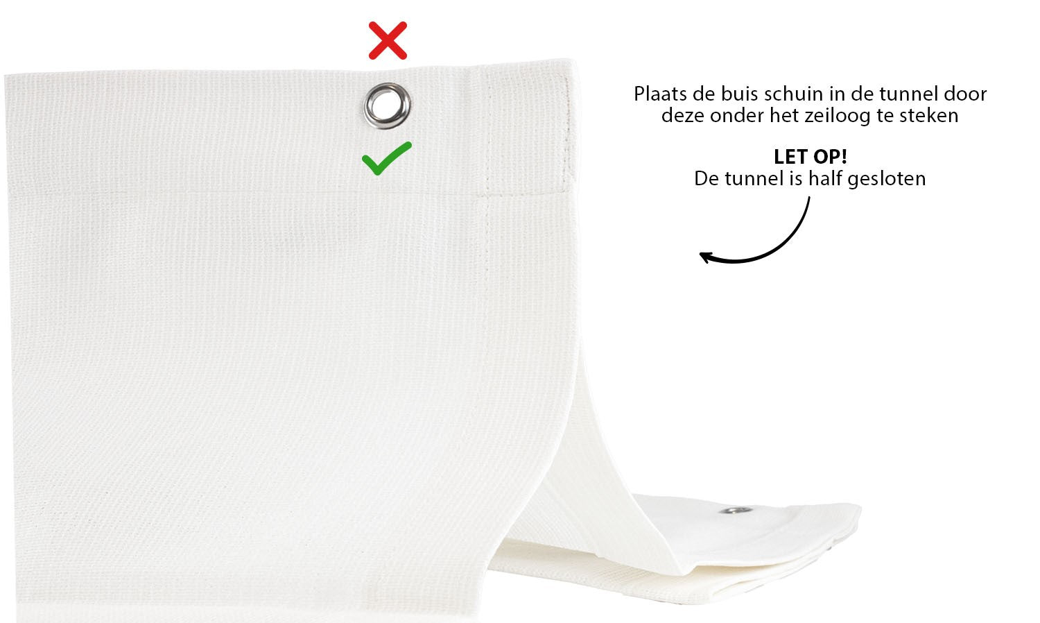 De standaardmaat van de staalkabels is 2 meter breed + 50 cm extra staalkabel. De kabels zijn professioneel geconfectioneerd met geperst draadeind. Gebruik altijd aluminium buizen onder de zeilogen bij de installatie (de tunnel is licht ingestikt zodat ze niet uitwaaien bij wind).